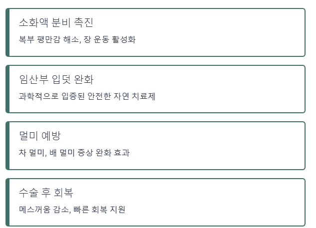 | 소화기 | 진지베인(효소) | 소화 촉진, 입덧 및 멀미 완화, 위장 보호 |