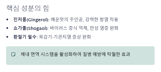 | 면역/항염 | 진저롤, 쇼가올 | 감기 예방, 만성 염증 완화, 살균 작용 |