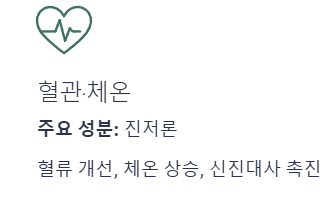 | 혈관/체온 | 진저론 | 혈류 개선, 체온 상승, 신진대사 촉진 |